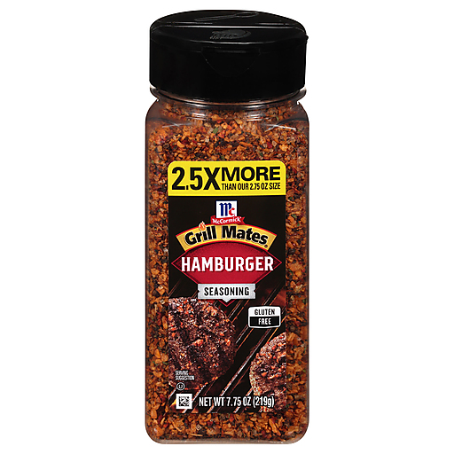 Make dinner extra special with just a shake of McCormick Grill Mates Hamburger Seasoning. Mix this savory blend of toasted onion, black pepper, chili pepper and garlic into ground beef or turkey for flavorful, juicy burgers every time. Packaged in an economical larger-size container, our value-priced Super Deal hamburger mix contains 2.5X more than our 2.75-ounce size. It's the perfect choice for endless mouthwatering burgers for quick and easy weeknight dinners as well as weekend backyard barbecue bashes. Beyond burgers, our seasoning is as versatile as it is tasty and great for steak, pizza and meatballs. Grill Mates Hamburger Seasoning is gluten free and made with McCormick spices, so you can grill with confidence.