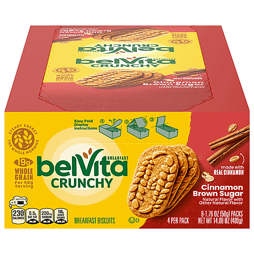 Start your morning off right with lightly sweet and crunchy belVita Cinnamon Brown Sugar Breakfast Biscuits. These bulk biscuits combine wholesome grains with the taste of cinnamon sugar for a delicious breakfast. Specially baked, these baked biscuits contain slow-release carbs that break down gradually in the body to deliver delicious, steady energy all morning long so you can enjoy these with your morning coffee, yogurt and fruit or as an instant breakfast food no matter what the morning brings. Each 50 gram serving of these bulk breakfast cookies contains 19 grams of whole grain, 2 grams of fiber and B vitamins for a delicious alternative to breakfast bars. A simple addition to your morning, these cholesterol-free bulk biscuits for breakfast contain no high-fructose corn syrup and no artificial colors, flavors or sweeteners. What are you waiting for? These convenient breakfast biscuits made with wholesome grains are a great alternative to traditional breakfast snacks. This bulk breakfast food is also an energizing alternative to snack bars and a wholesome addition to college care packages. Each individual pack contains four belVita Cinnamon Brown Sugar Biscuits for you to enjoy on the go, at the office or at home for lasting morning energy.