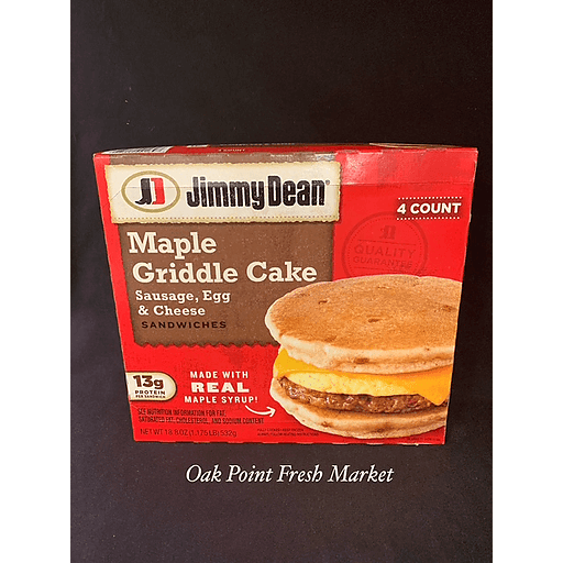 Skip the drive-thru and enjoy a warm breakfast sandwich at home. Jimmy Dean Sausage, Egg and Cheese Maple Griddle Cake Sandwiches are a sweet way to start your day. Each breakfast sandwich is made with our signature seasoned sausage, eggs and melty cheese all between two fluffy pancakes made with real maple syrup. To prepare, simply warm in the microwave for less than two minutes and enjoy a convenient and filling breakfast sandwich packed with 13 grams of protein per serving. Every box contains 4 Jimmy Dean breakfast sandwiches. Keep frozen until you’re ready to prepare your breakfast and get your day started.