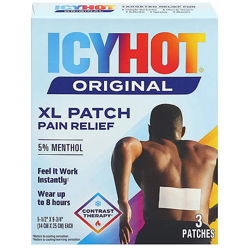 Make a comeback from pain with Icy Hot Original Pain Relief Patches, XL Size. Each pack contains 3 patches made for very large areas of pain that are powered by contrast therapy*, providing fast-acting relief for sore muscles and joints with a cooling sensation to dull pain followed by a warming sensation to relax it away. These patches use menthol 5% to target and relieve backaches, lower back pain; pain from strains, sprains and bruises; and arthritis pain. Easily apply the comfortable fabric patch to the affected area and wear it for up to 8 hours. Keep Icy Hot in your gym, work, or travel bag for powerful pain relief on the go.