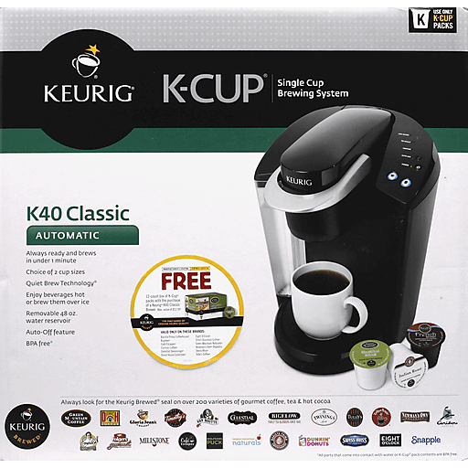 Model No. K40. Use only K-Cup packs. Always ready and brews in under 1 minute. Choice of 2 cup sizes. Quiet brew technology. Enjoy beverages hot or brew them over ice. Removable 48 oz water reservoir. Auto-off feature. BPA free (all parts that come into contact with water or K-Cup pack contents are BPA free). Always look for the Keurig Brewed seal on over 200 varieties of gourmet coffee, tea & hot cocoa: Keurig Brewed; Green Mountain Coffee; Diedrich Coffee; Gloria Jean's Coffees; Timothy's World Coffee; Van Houtte; Celestial Seasonings; Bigelow: Family Tea Blenders Since 1945. Twining's; Tully's Coffee; Coffee People; Newman's Own Organics; Caribou Coffee; Emeril's Gourmet Coffee; Folgers Gourmet; Millstone; Cafe Escapes; Wolfgang Puck; Green Mountain Naturals; Barista Prima Coffeehouse; Dunkin' Donuts; Swiss Miss Hot Chocolate; Eight O'Clock; Snapple. Removable 48 oz water reservoir brews multiple consecutive cups before refilling. Brew Over Ice: Iced tea and iced coffee taste best when fresh-brewed hot over ice. Choose a K-Cup pack, fill a plastic cup with ice and press your favorite cup size. Automatic: auto-off; indicator lights. 2 Cup Sizes (dispensed volume typically 5.25 oz and 7.25 oz. Mugs and plastic cups not included): small cup (6 oz); small mug (8 oz). The Perfect Cup Every Time: Maintains water temperature at the perfect brewing temperature. Delivers the exact amount of water precisely timed for optimal flavor. Monitors water levels to ensure a full cup every time. Removable drip tray allows room for your travel mug. Choose from over 200 coffee, tea & hot cocoa varieties from our Keurig Brewed gourmet partners at www.keurig.com. Choose: Select from over 200 varieties of coffee, tea and hot cocoa from our Keurig Brewed gourmet partners - nearly any flavor you can imagine - brewed over hot or over ice. With so many choices, there's always something to make everyone happy. Brew: Place your K-Cup pack in the brewer, lower the handle and press your favorite cup size. It's as simple as that, ready in 60 seconds or less, and there's never any grinding, measuring or clean up. Enjoy: Whether it's a mug of hot coffee in the morning, a relaxing cup of afternoon tea or a refreshing iced beverage, one-cup brewing means it's always fresh and delicious. Every cup. Every time. Keurig Brewed: The only mark of genuine Keurig quality. Keurig Brewed is our promise. Since the beginning, we've been dedicated to the art and science of bringing you the coffee you love, every time. Always look for the Keurig Brewed seal. Keurig Brewed: Keurig K-Cup packs. The coffee you love. Flavor in. Oxygen out. An air tight seal ensures coffee remains fresh and delicious. Always fresh. The finest beans selected, roasted, ground and measured to exacting specifications. What brings out the flavor you love? The ideal brewing environment inside. Oxygen free, the perfect grind, advanced filtration and water at the optimum pressure and temperature. Your perfect cup. With over 200 varieties from which to choose, your perfect cup is just seconds away. Gourmet coffee; hot tea; hot cocoa; iced tea; iced coffee. All this and more at the touch of a button. 200 Varieties from Leading Gourmet Brands: The world's premier coffee, tea and hot cocoa brands trust Keurig to deliver a perfect cup every time. With over 200 varieties of K-Cup packs from our Keurig Brewed gourmet partners, you'll find plenty to suit you and everyone in your household. They're delicious, magically brewed and provide you with nearly unlimited choices. Brew Over Ice: Brewing every cup fresh is great for hot beverages, but did you know iced tea and iced coffee also taste best when fresh-brewed hot over ice? Try it with your favorite K-Cup pack and you'll know why! Now there are even more refreshing choices no matter what the season. C UL US listed. For household use only. Visit our web site at: www.keurig.com. Printed in China. Made in China.
