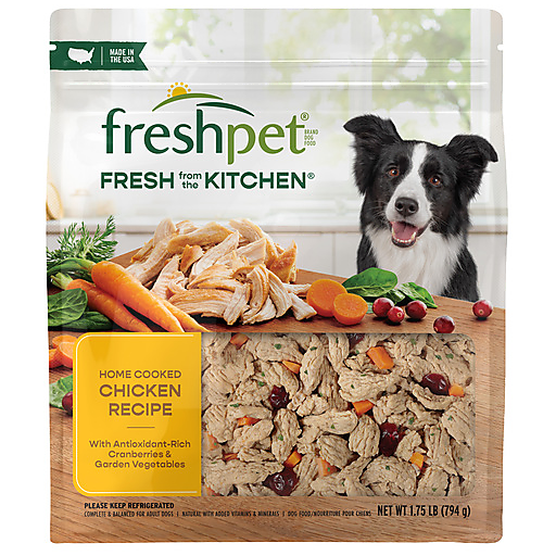 Fresh from Freshpet's Kitchens with locally sourced shredded chicken and essential vitamins from carrots, spinach, and antioxidant-rich cranberries. Now you can easily provide the love of a homemade, high-protein, fresh meal to your dog in a convenient resealable bag.