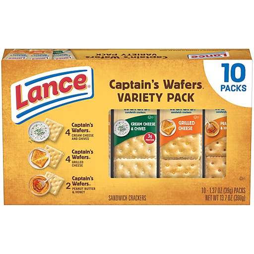 Lance Captain’s Wafers snack lovers won't be able to get enough of this sandwich cracker variety pack! Three of your favorite flavors with delicious fillings between two crispy classic Captain’s Wafers crackers for satisfying goodness. You get a total of 10 cracker snack packs: 4 packs of Captain’s Wafers Cream Cheese & Chives, 2 packs of Captain's Wafers Peanut Butter and Honey, and 2 packs of Captain's Wafers Grilled Cheese. So, you can enjoy a perfect snack for breaks, afternoon snacks, or whenever you’re hungry between meals. They’re also ideal for packing when you’re on-the-go snacking. With this convenient Lance variety pack, you can grab all that delicious, goodness, any time. Hunger doesn’t stand a chance when you fuel up these tasty Lance sandwich crackers. At Lance, sandwiches mean more: they aren’t just two somethings with whatever in the middle. Or, as we say, a Lance Sandwich cracker is two awesomes on the outside with totally incredible in the middle. Lance has been fueling families for more than 100 years. Lance Sandwich crackers, the king of all sandwich crackers. Bring it!
