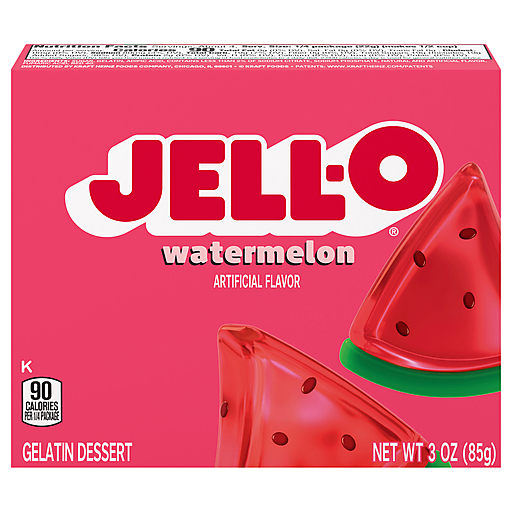 Snack happy. Jell-O Watermelon Artificially Flavored Gelatin Dessert Mix lets you add some wonder to your day with a delicious snack. Spoon up a smile with our artificially flavored watermelon Jell-O gelatin that contains 90 calories per serving. Our colorful, jiggly treat is perfect for everyday snacking or special occasions with family and friends. Additionally, our gelatin dessert mix is a versatile ingredient for creating desserts like poke cakes, parfaits, pretzel salads, rainbow layer cakes and more. Our artificially flavored watermelon gelatin dessert is easy to prepare. Simply add 1 cup boiling water to the gelatin mix, stir for 2 minutes until completely dissolved, stir in 1 cup cold water, then refrigerate for 4 hours or until firm. Each Jell-O gelatin dessert mix is individually packaged in a 3-ounce sealed pouch and makes 4, 1/2-cup servings.